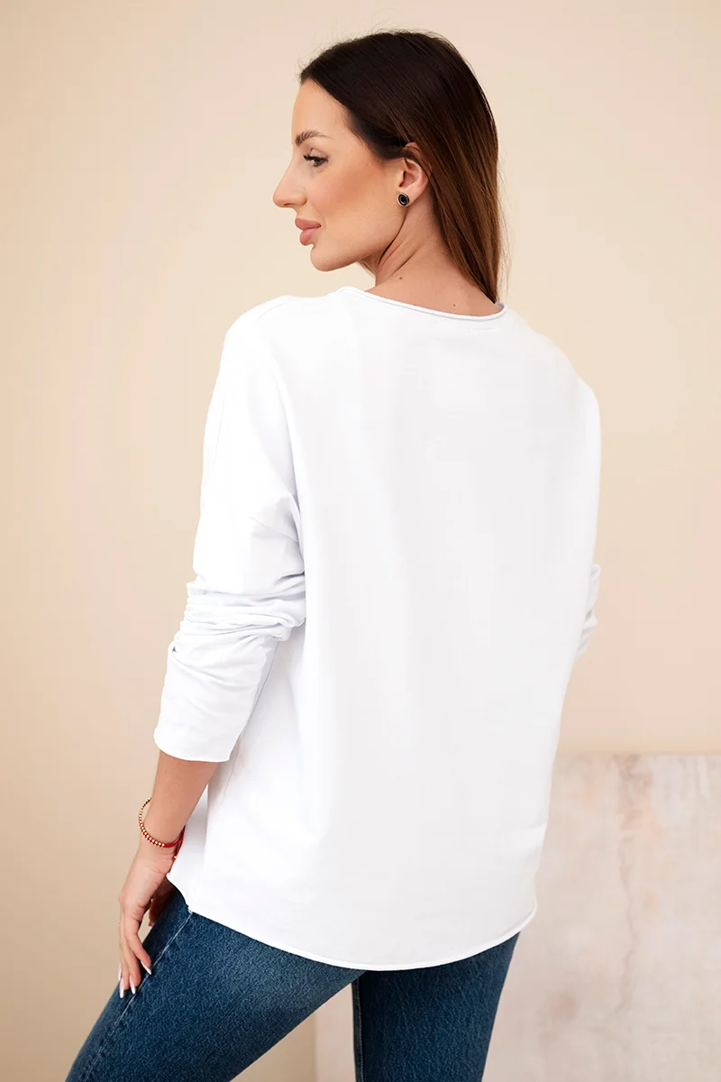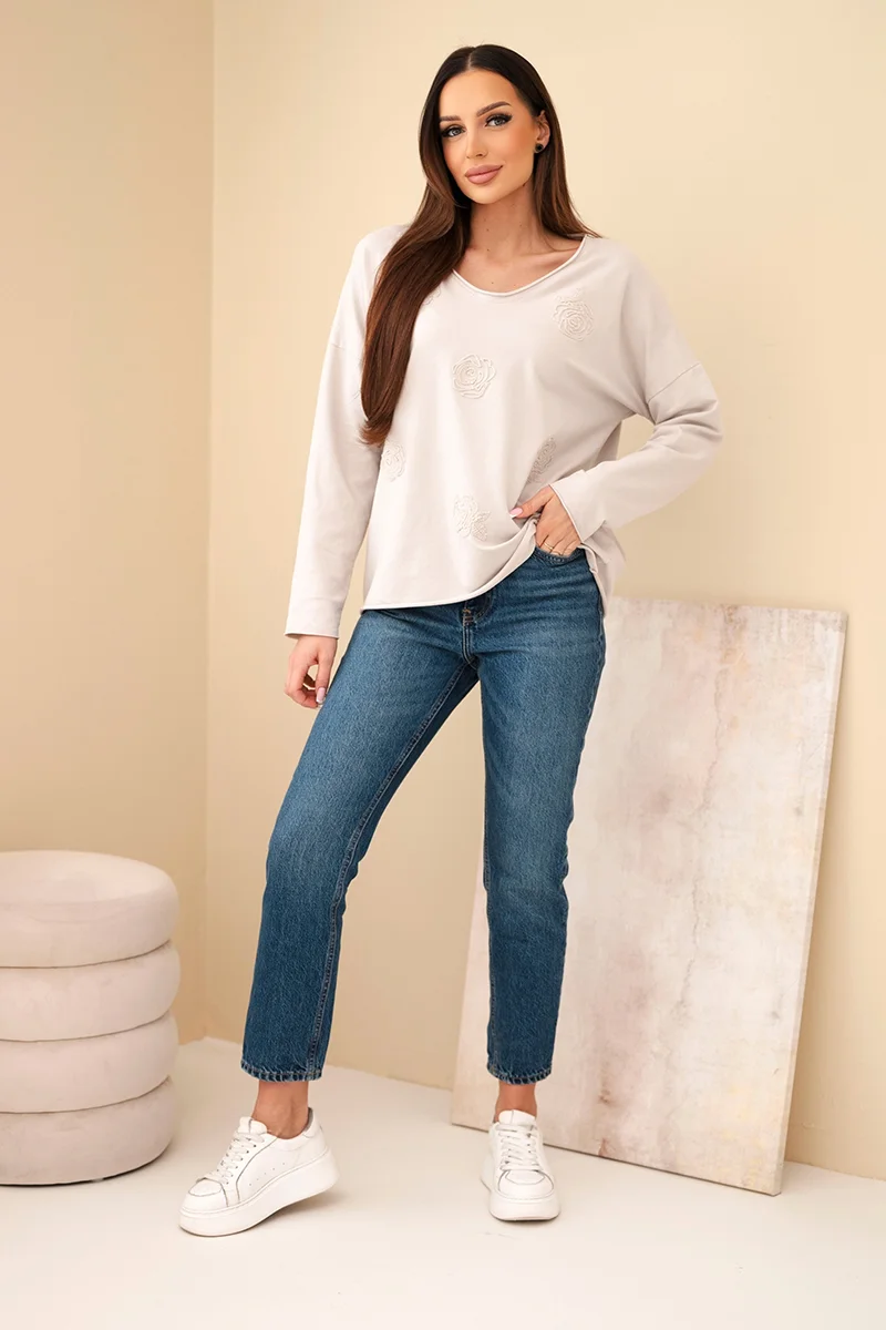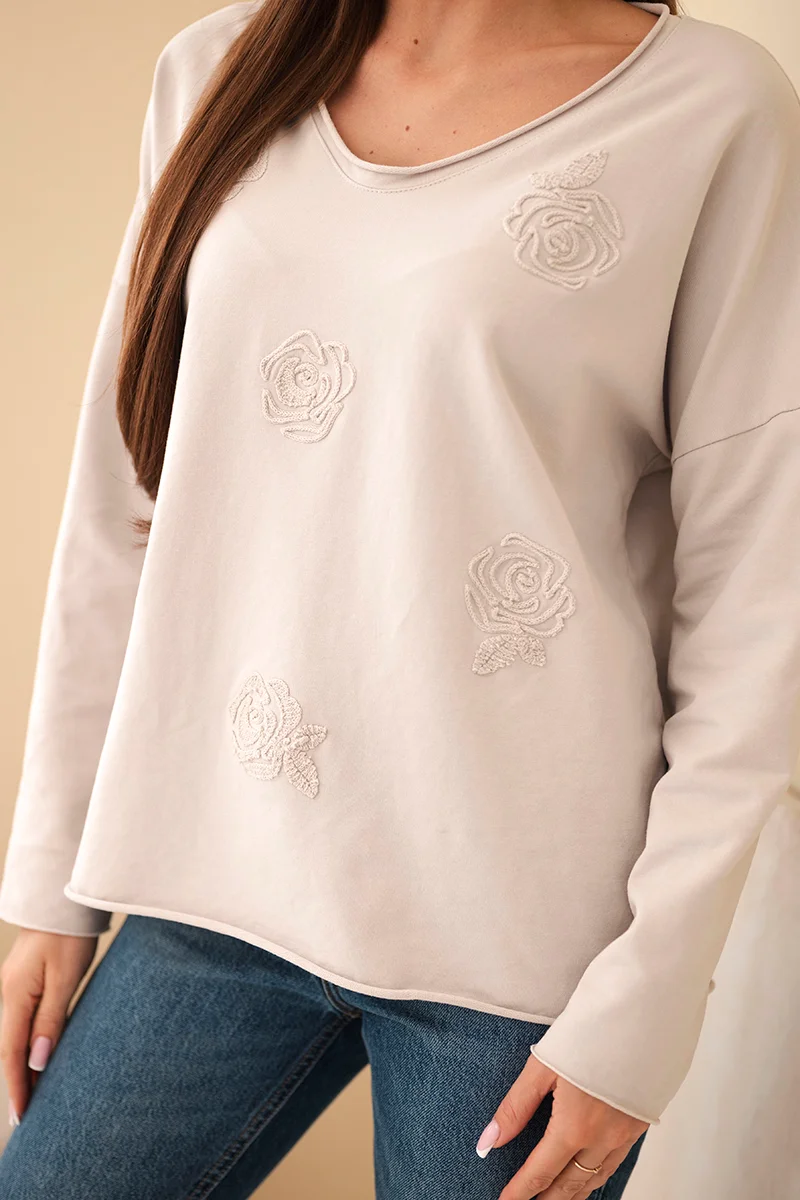 Bluzka damska bawełniana z haftowanymi kwiatami i dekoltem V beżowa