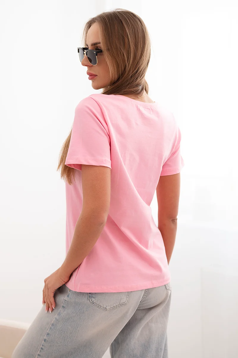 Bluzka damska bawełniana z krótkim rękawem i naszywką z perełkami różowy neon