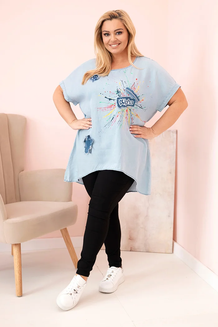 Bluzka damska Plus Size z naszywkami jasno jeansowa