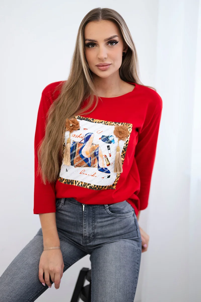 Bluzka z grafiką i kolorową kokardą 3D czerwona