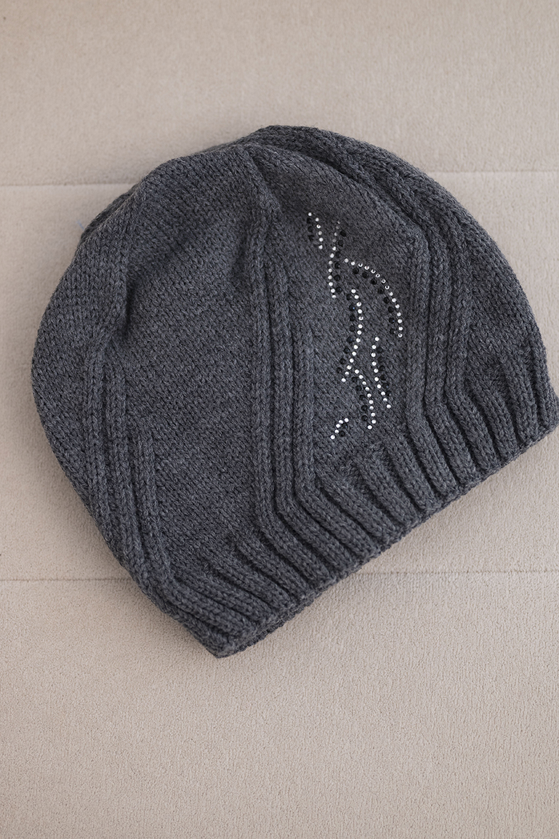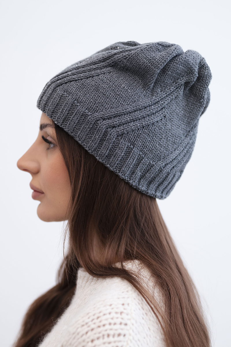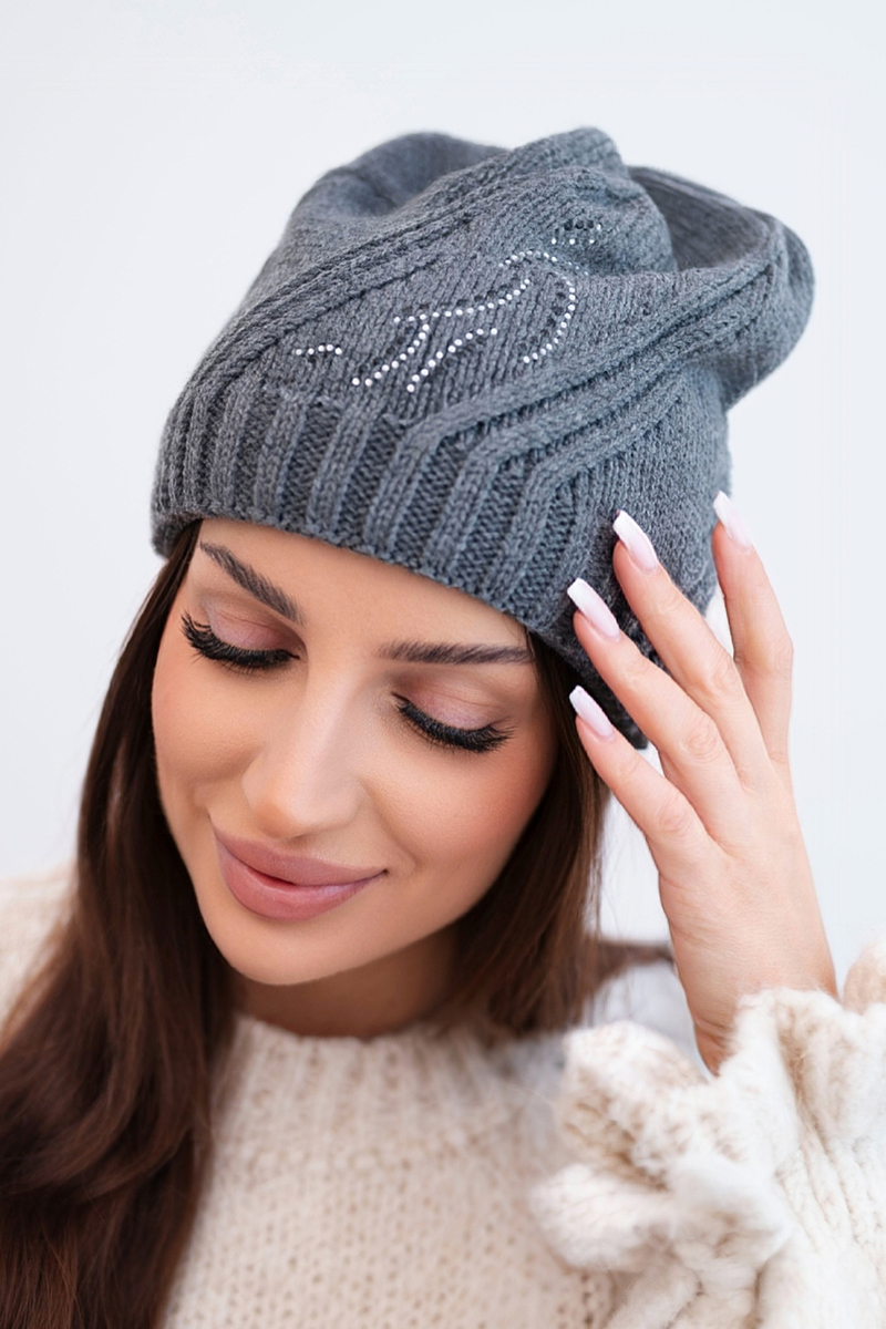 Czapka damska wełniana zimowa z geometrycznym wzorem i delikatnym połyskiem K401 ciemno szara