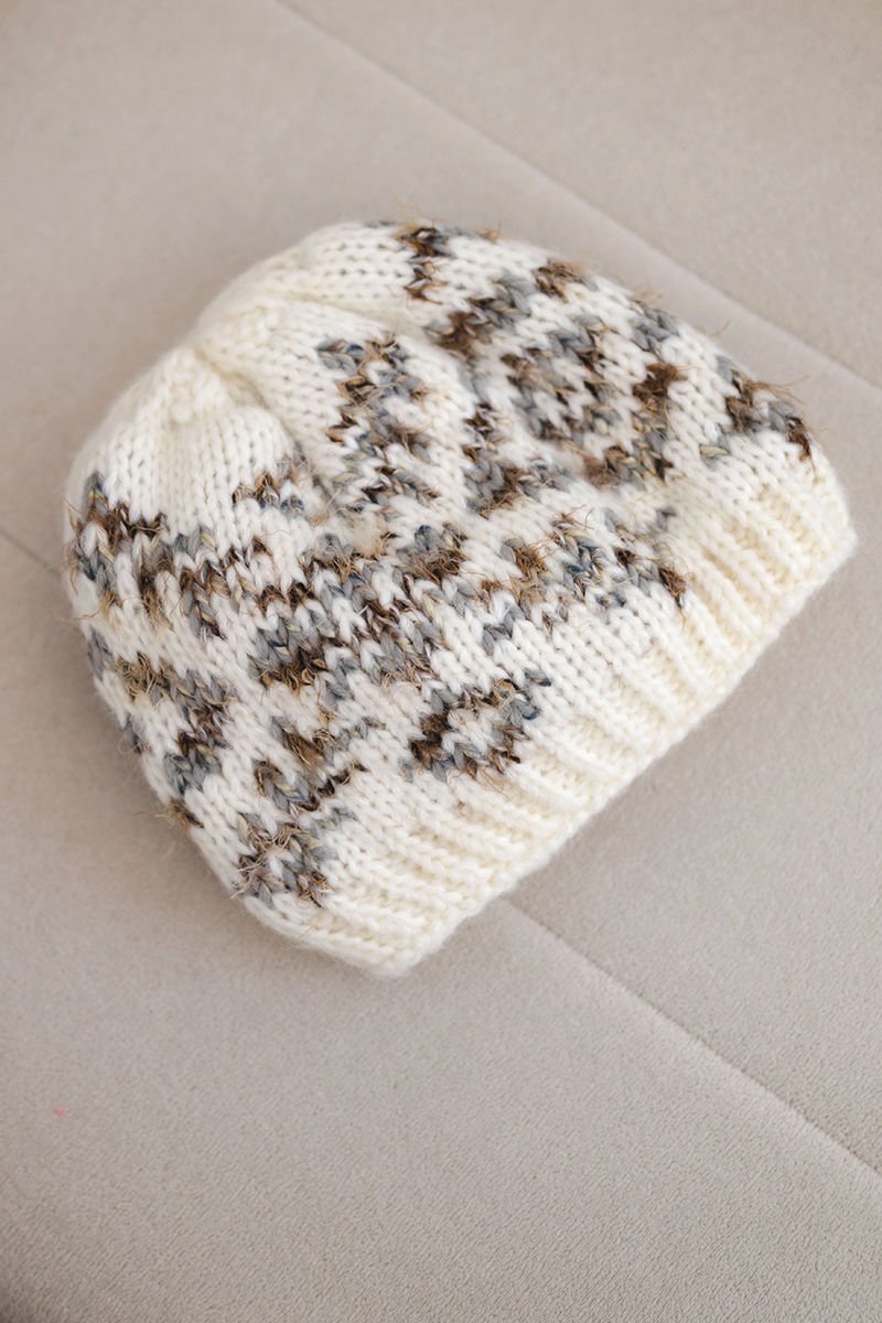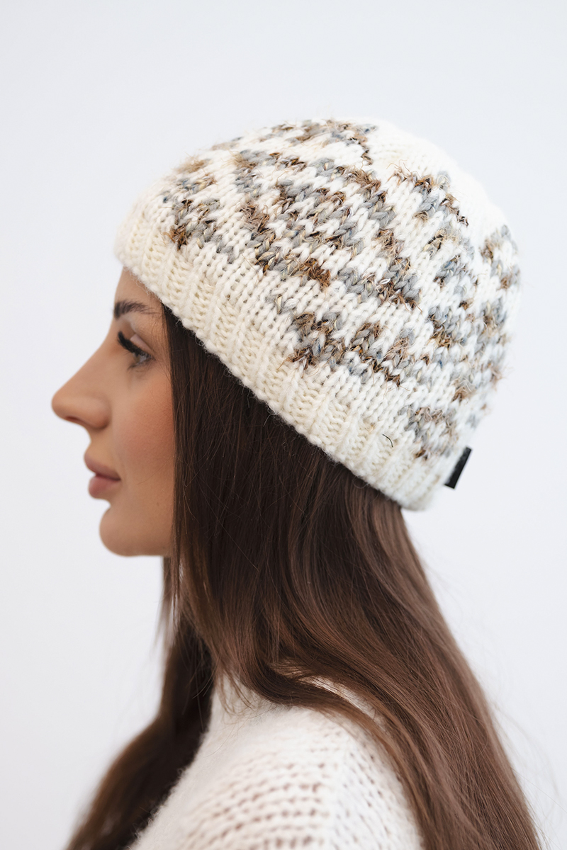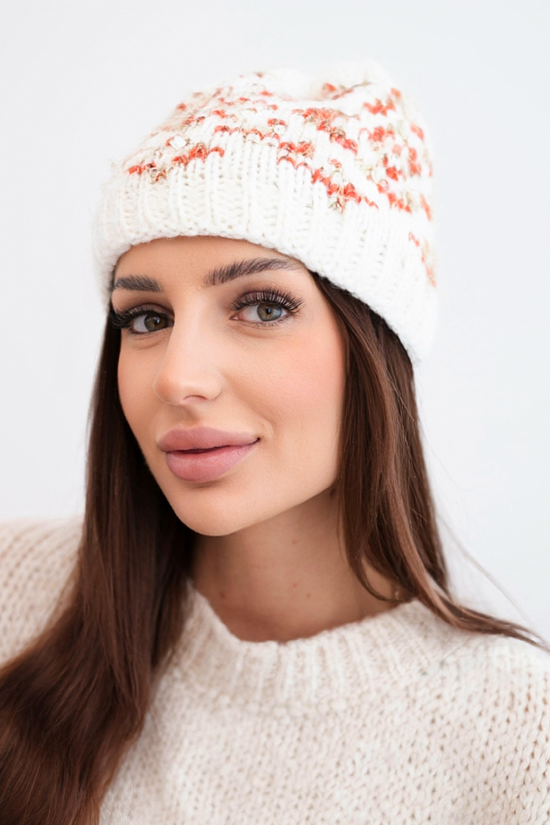 Czapka zimowa damska z kolorową przędzą i grubym ściągaczem K355 ecru+khaki+ciemny różowy
