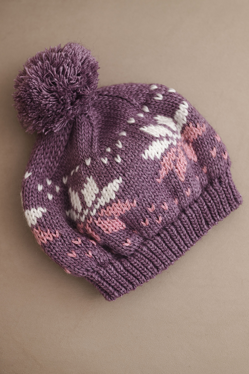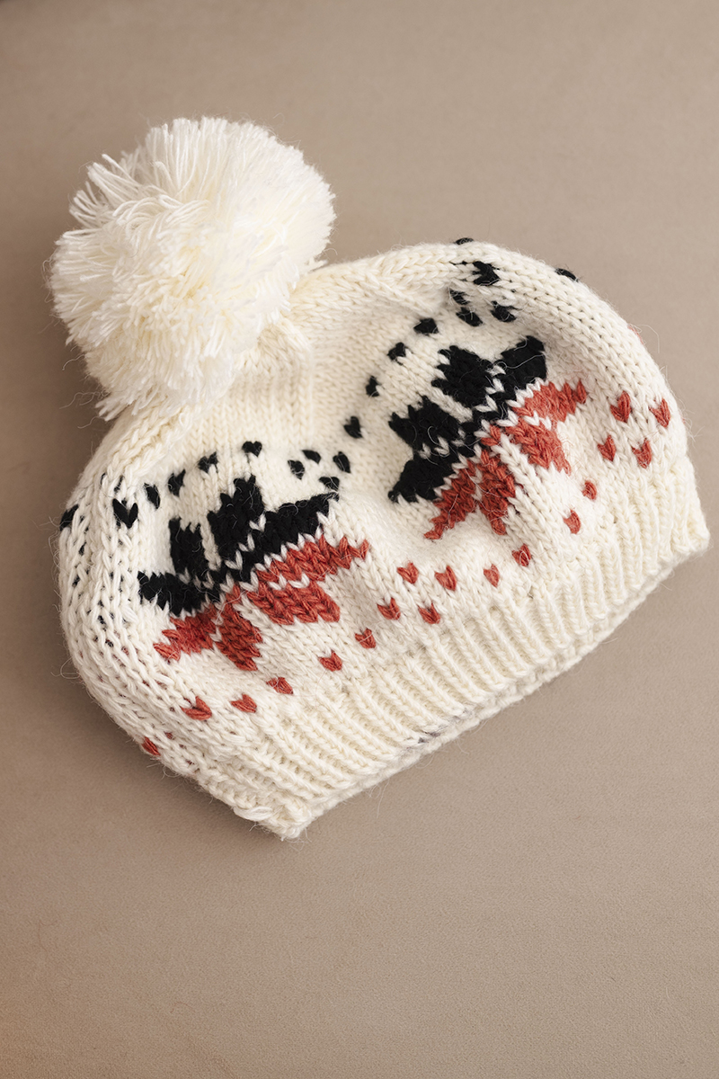 Czapka damska zimowa wełniana z motywem śnieżynek i pomponem K457 ruda