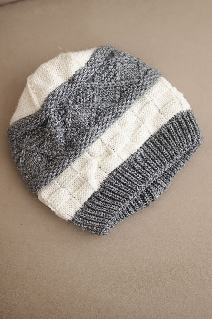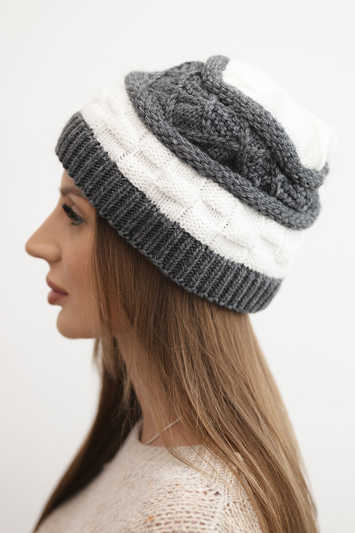 Czapka damska zimowa wełniana z ozdobnym splotem K446 grafitowa + biała