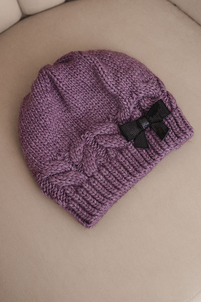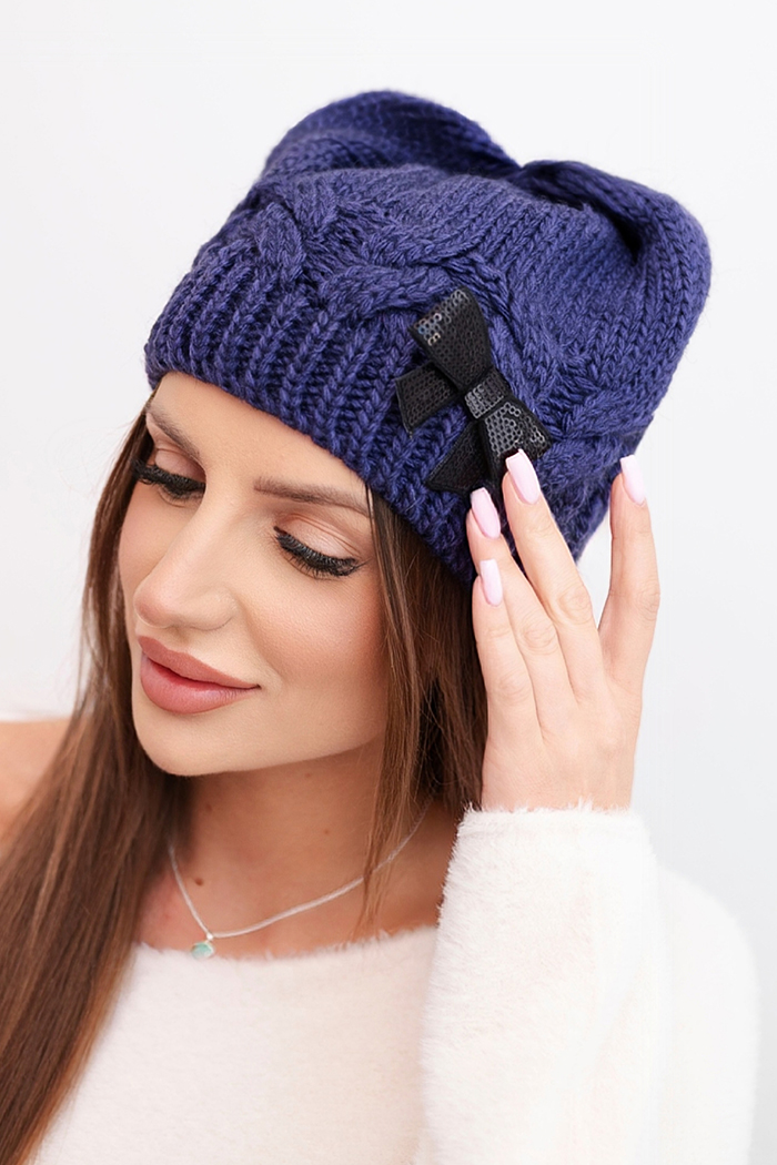 Czapka damska zimowa z ozdobną kokardką i splotem warkoczowym K438 ecru