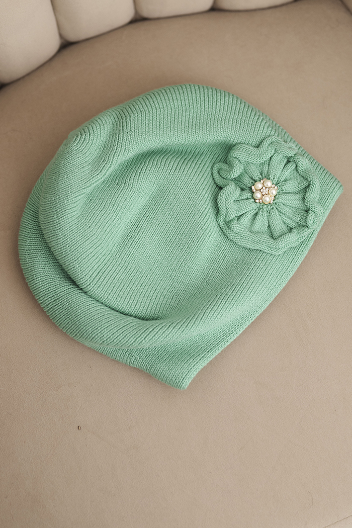Czapka damska zimowa z ozdobnym kwiatem i perełkami K421 ciemno miętowa