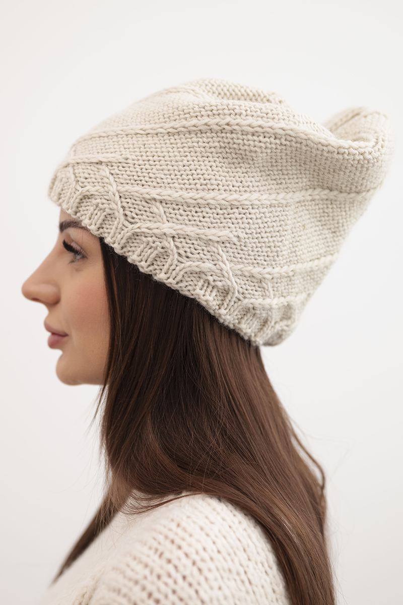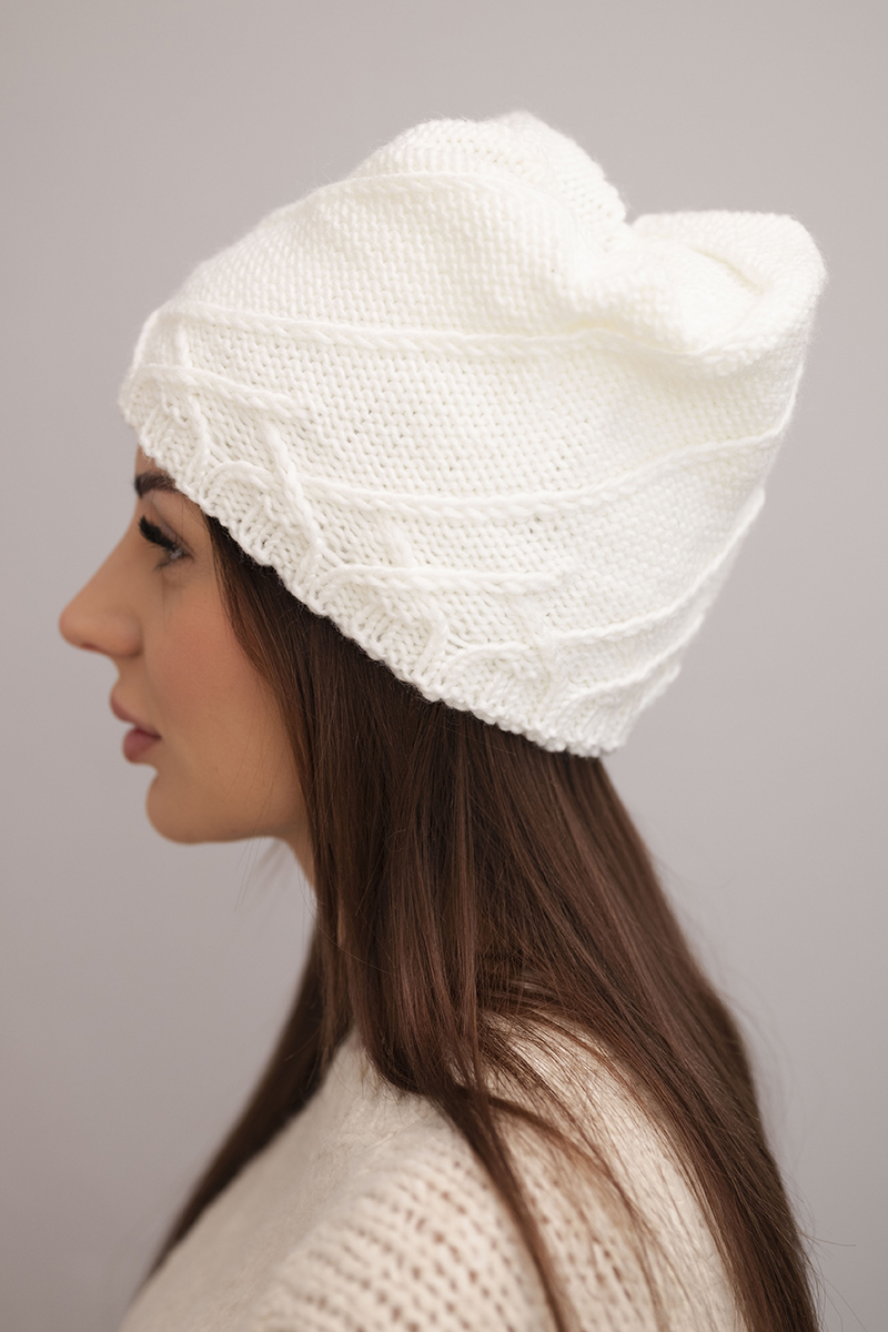 Czapka damska zimowa wełniana z ozdobnymi cyrkoniami i plecionym wzorem K396 ecru