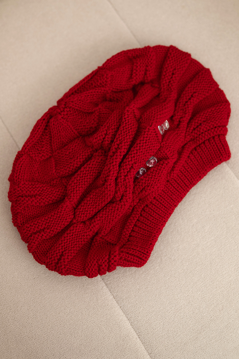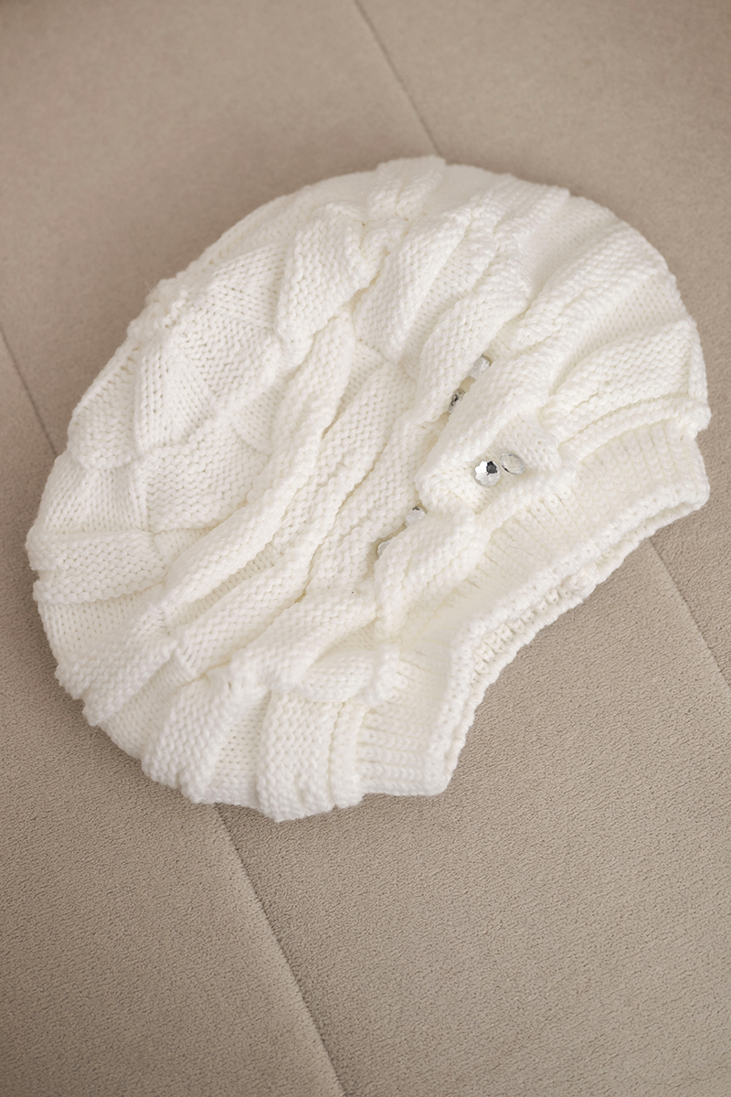 Czapka damska zimowa wełniana z ozdobnym splotem i dżetami K397 ecru