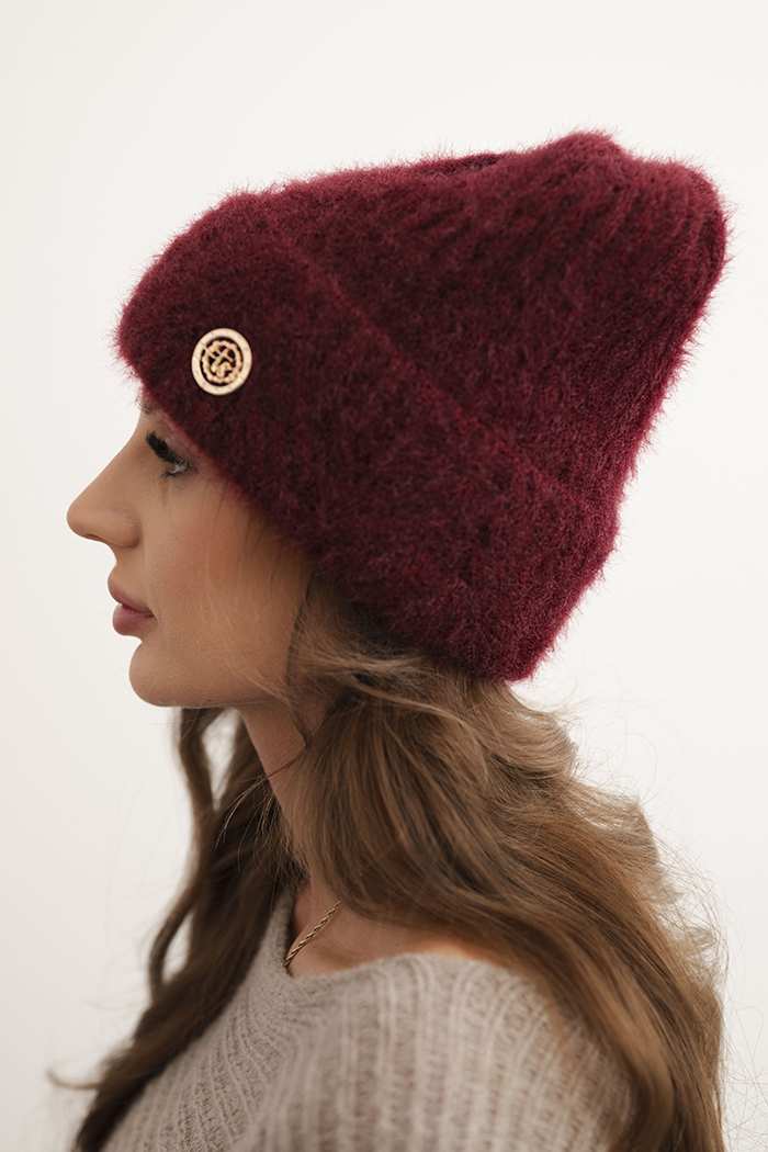 Czapka damska zimowa puszysta z ozdobnym guzikiem bordowa