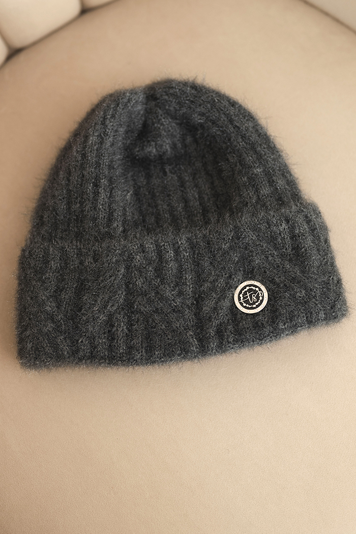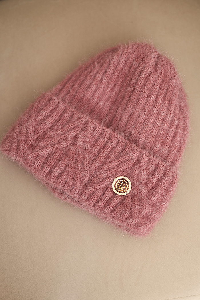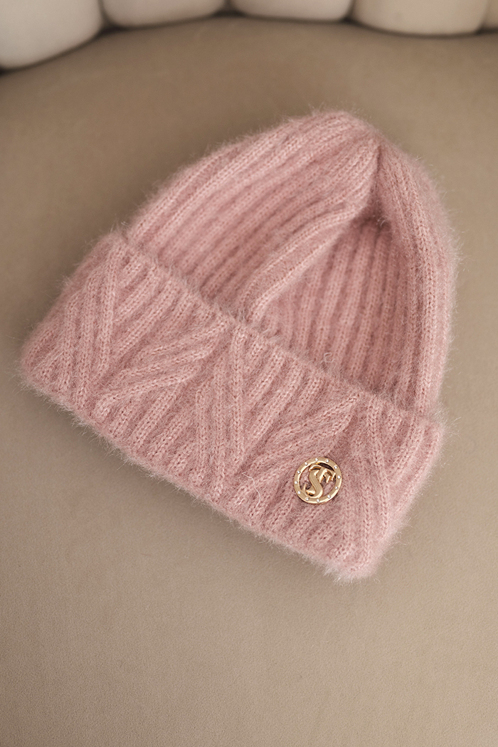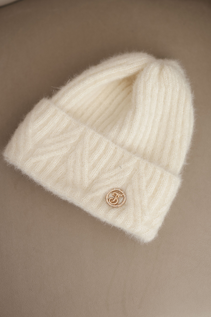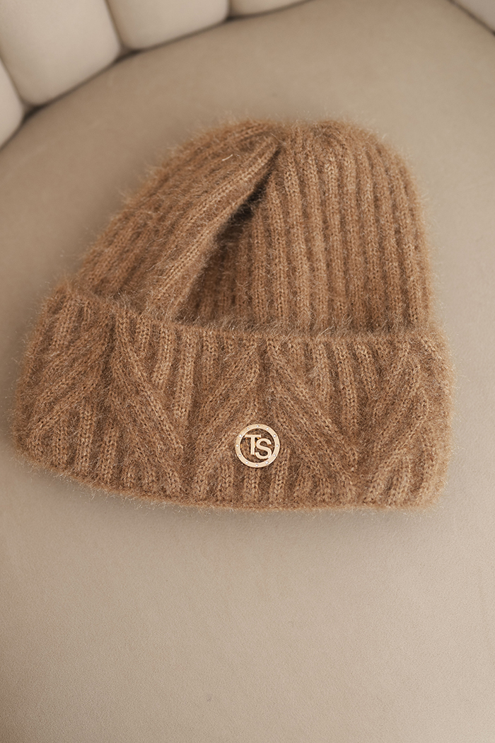 Czapka damska zimowa z puszystej dzianiny i z eleganckim guzikiem camelowa