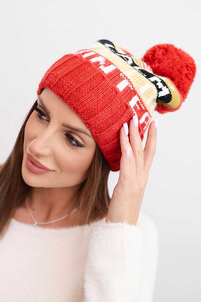Czapka damska zimowa z wełną i napisem z dużym pomponem K422 ciemny pudrowy róż