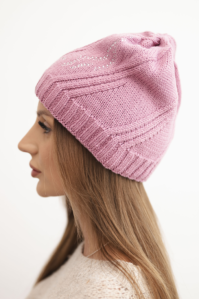 Czapka damska zimowa z wełny z przeplatanym wzorem K443 biała + różowa