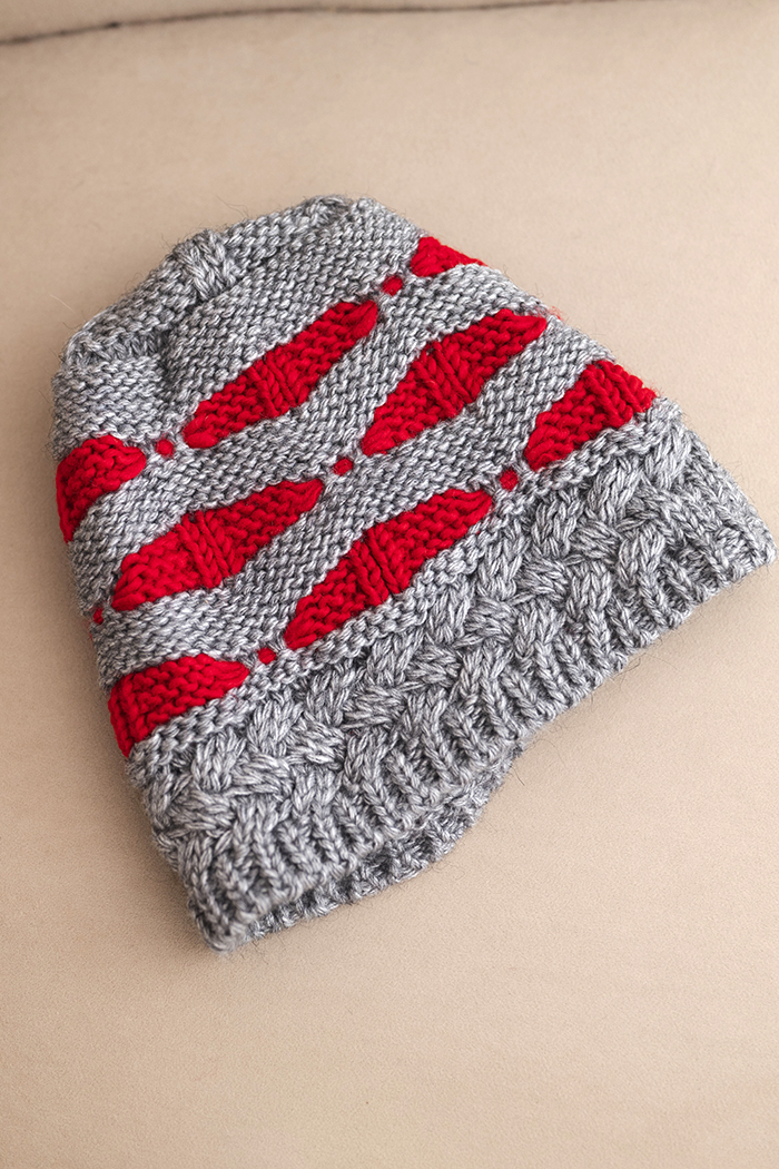 Czapka damska zimowa z wełną w gruby splot i paski K465 grafitowa + biała