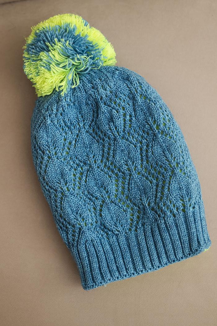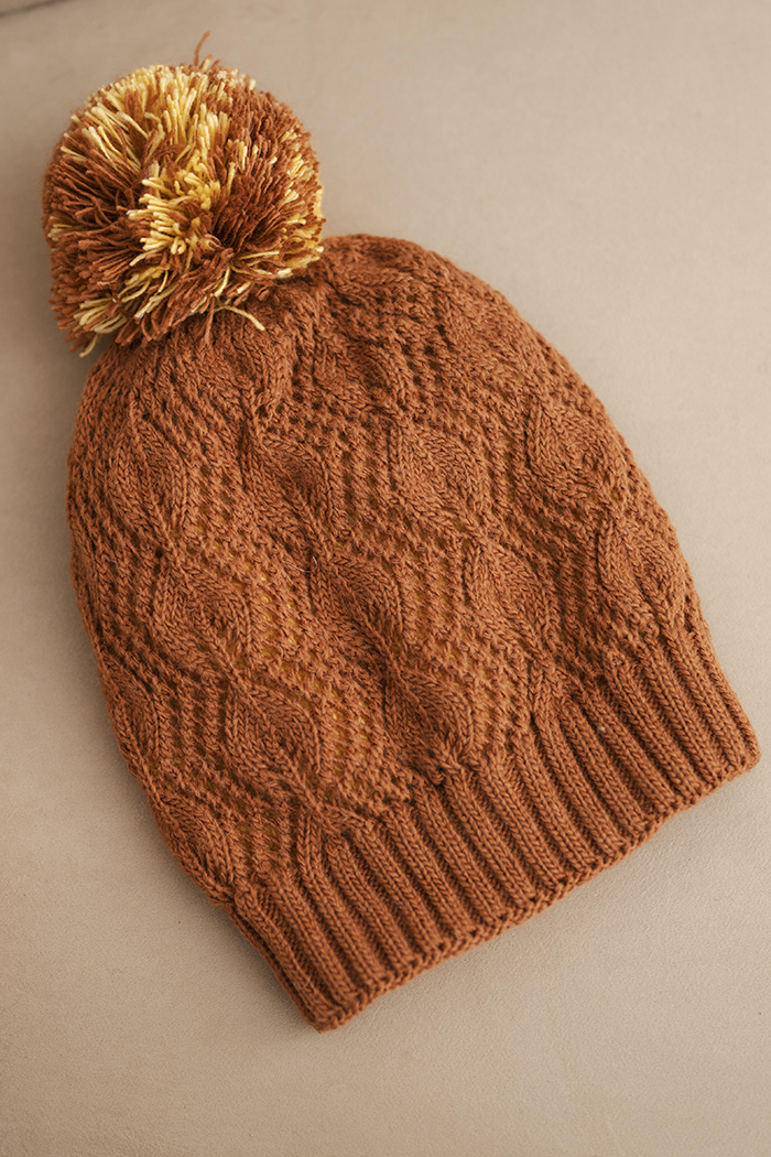 Czapka damska zimowa z wełną w ozdobny splot z pomponem K467 brązowa