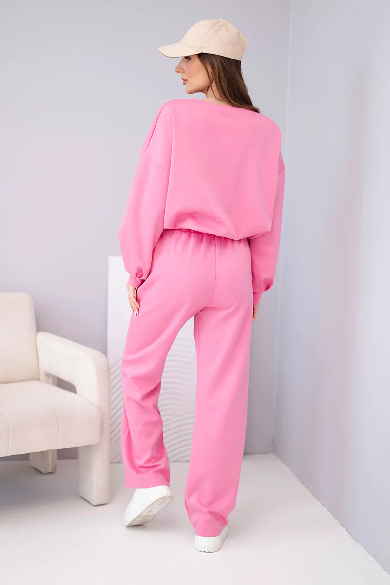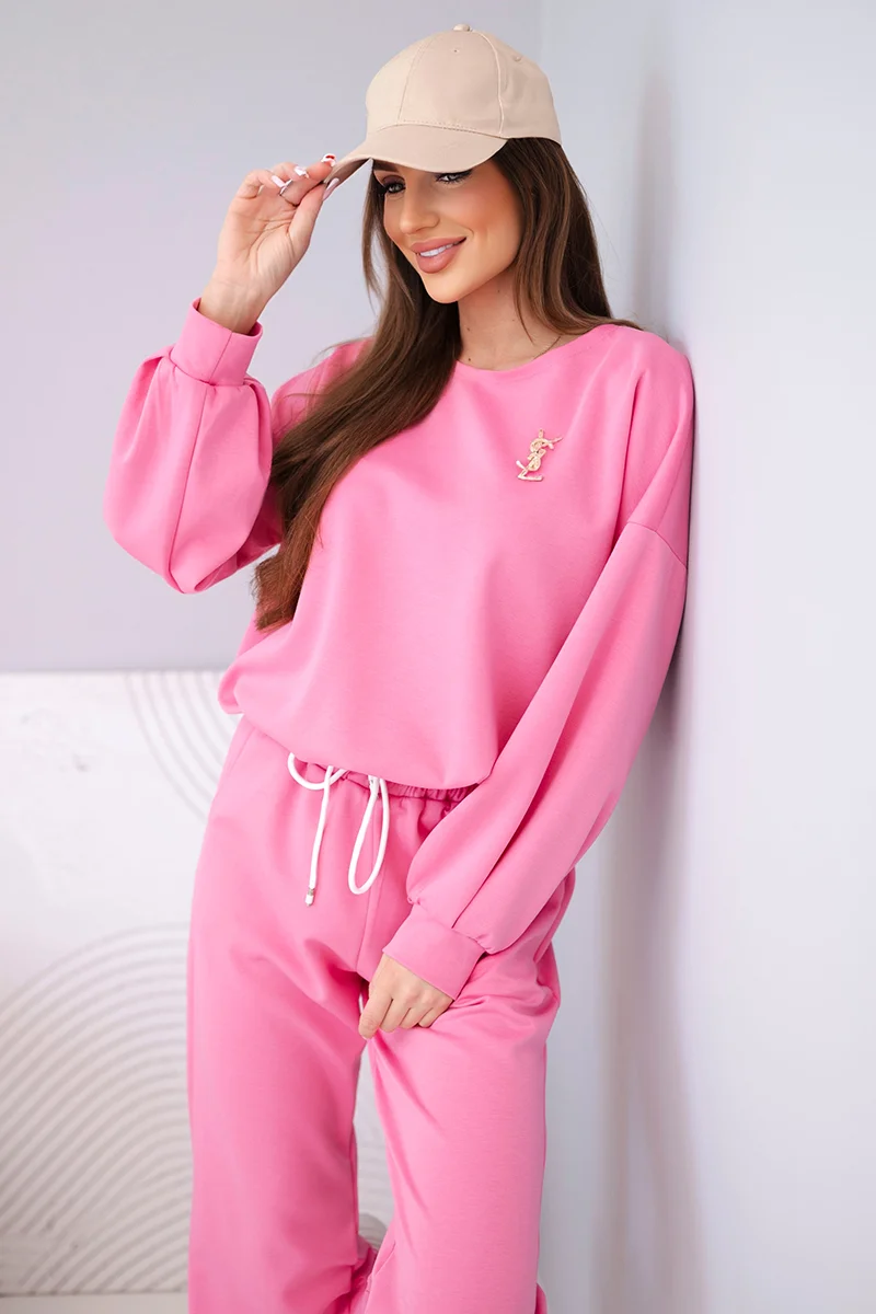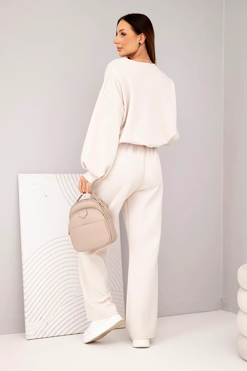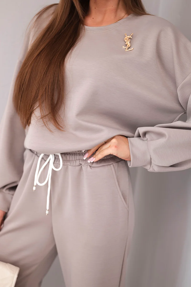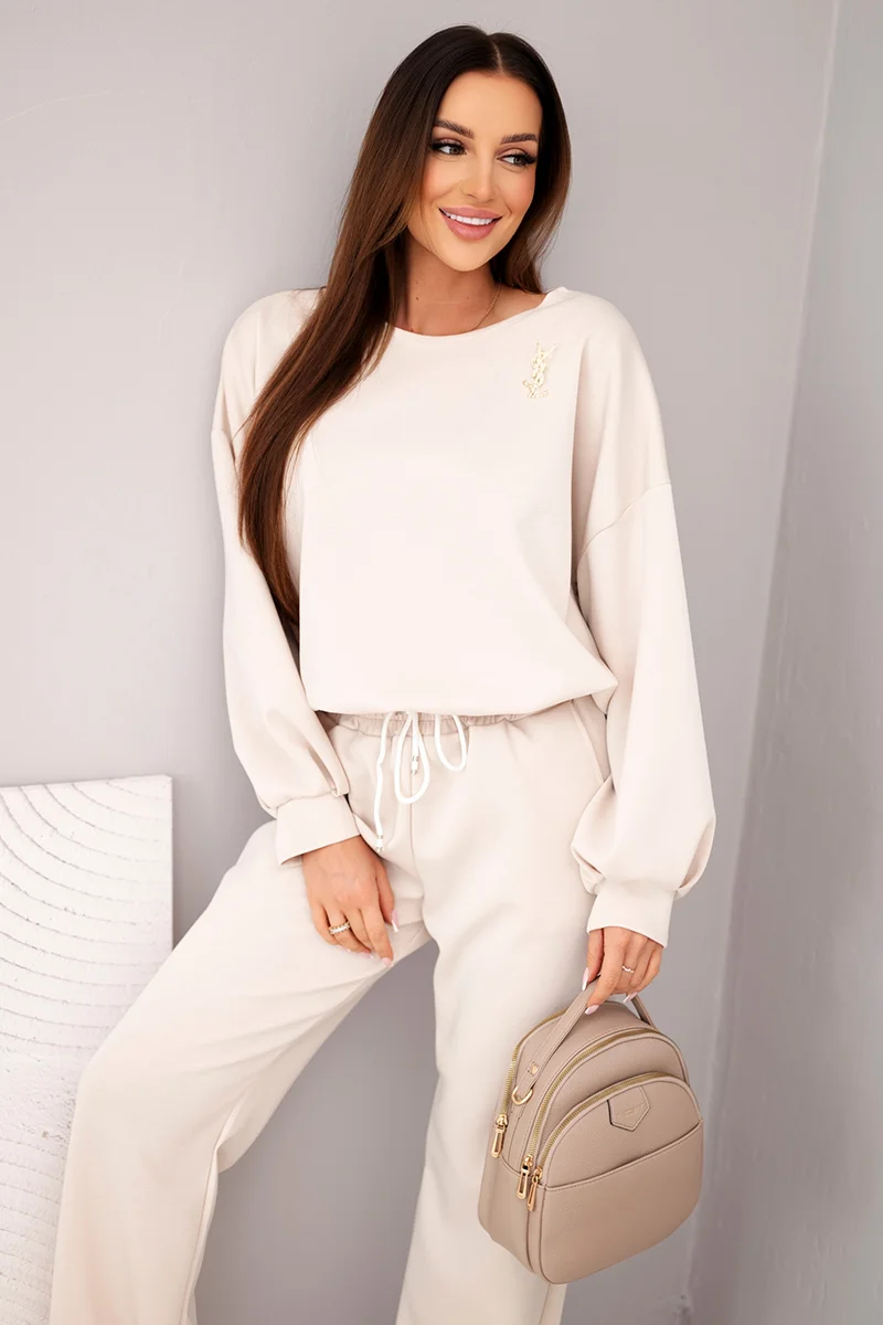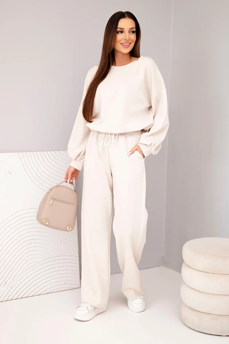 Komplet damski masełko bluza z broszką i spodnie z prostą nogawką fango
