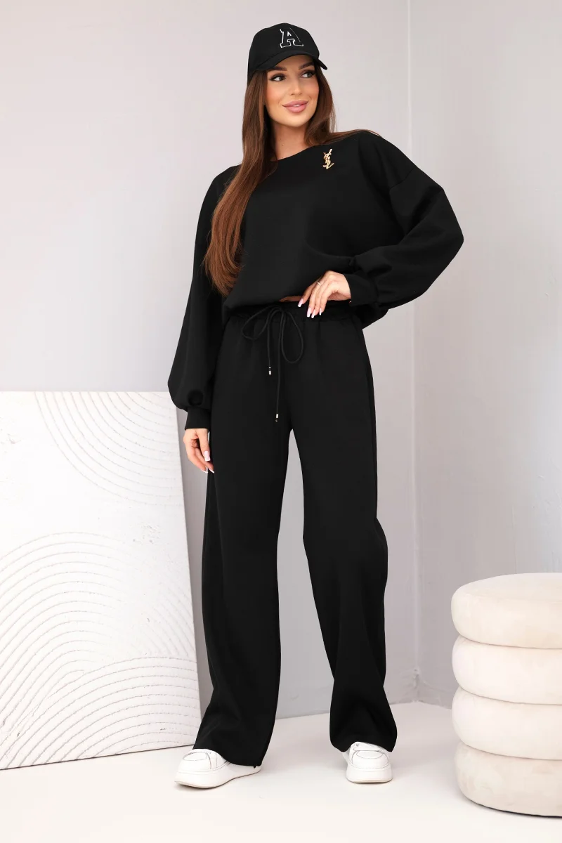 Komplet damski masełko bluza z kołnierzykiem i proste spodnie czarny