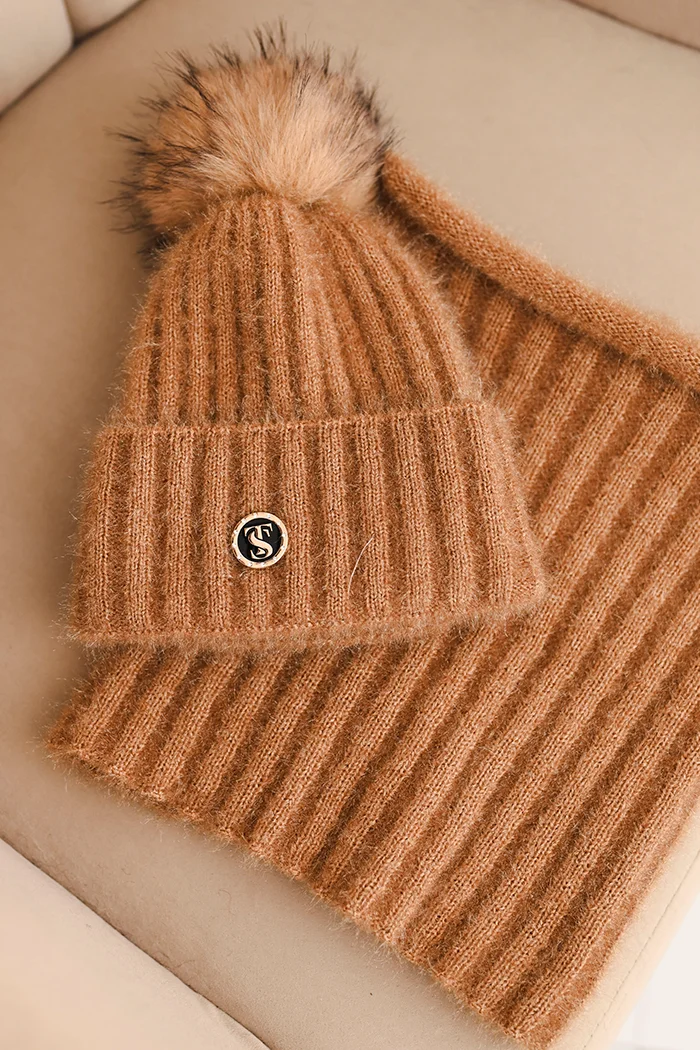 Komplet damski zimowy z pomponem i komin jasny pudrowy róż