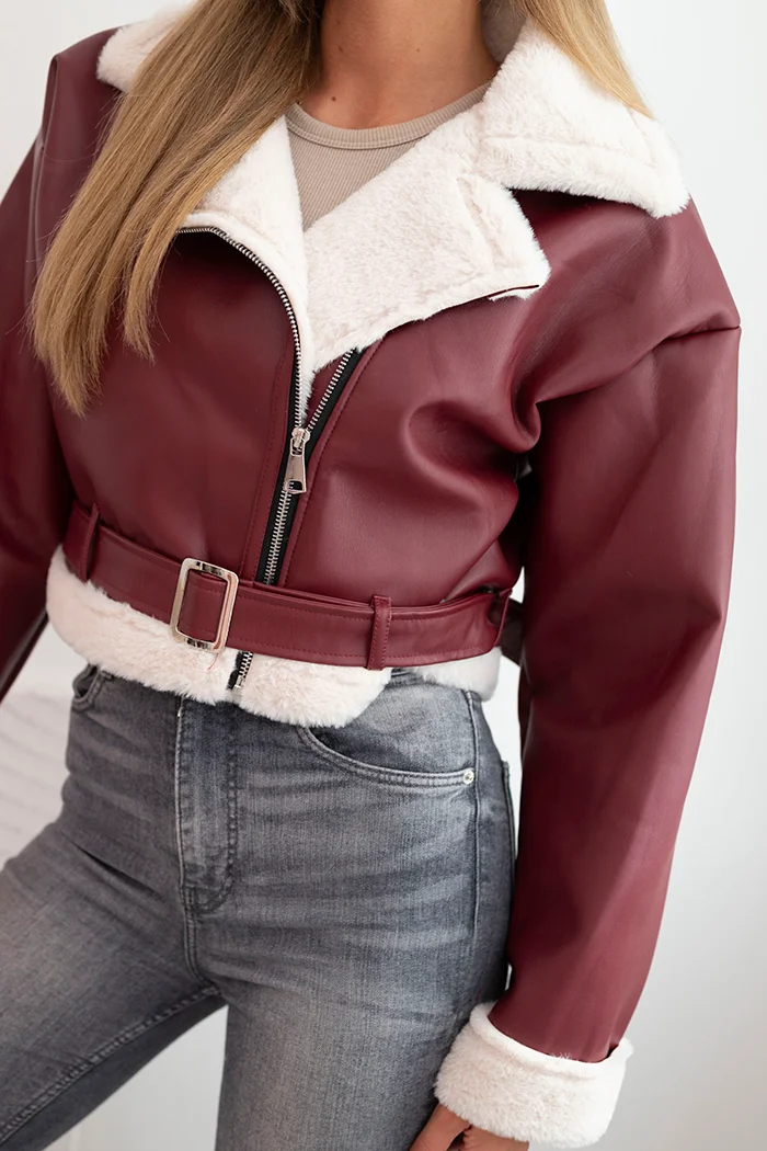 Kurtka damska krótka z eko skóry z paskiem i kołnierzem beżowa