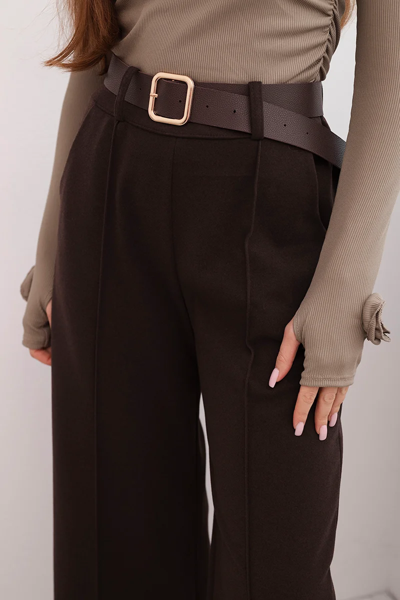 Spodnie damskie eleganckie z paskiem i szeroką nogawką brązowe