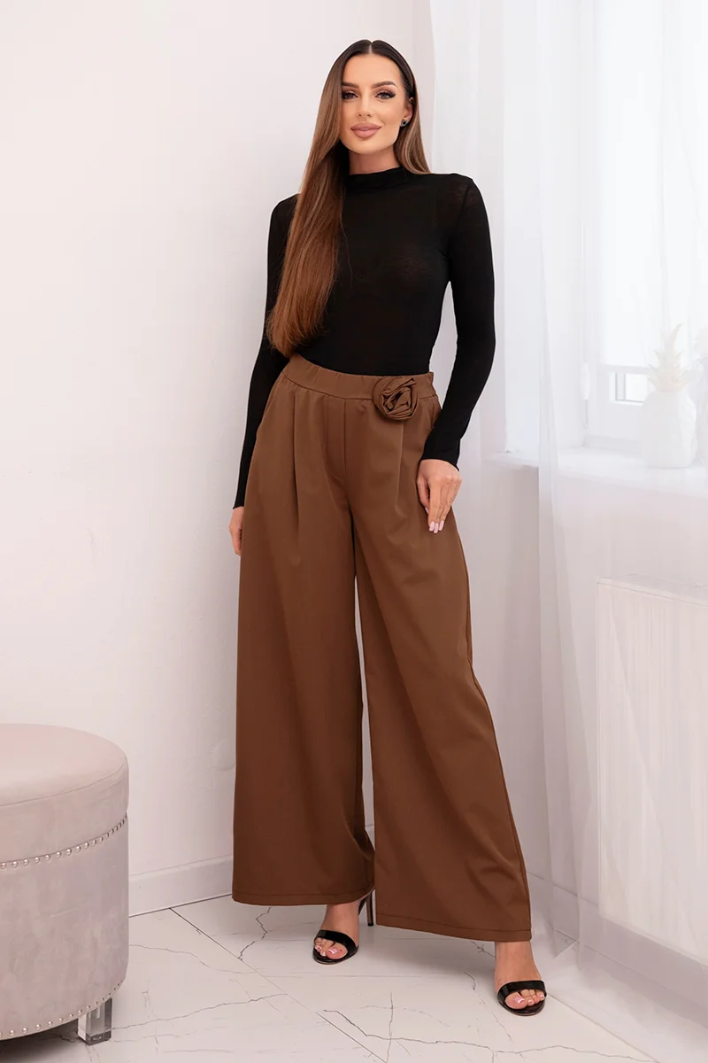 Spodnie damskie eleganckie z szeroką nogawką i ozdobnym kwiatem cukierkowy róż