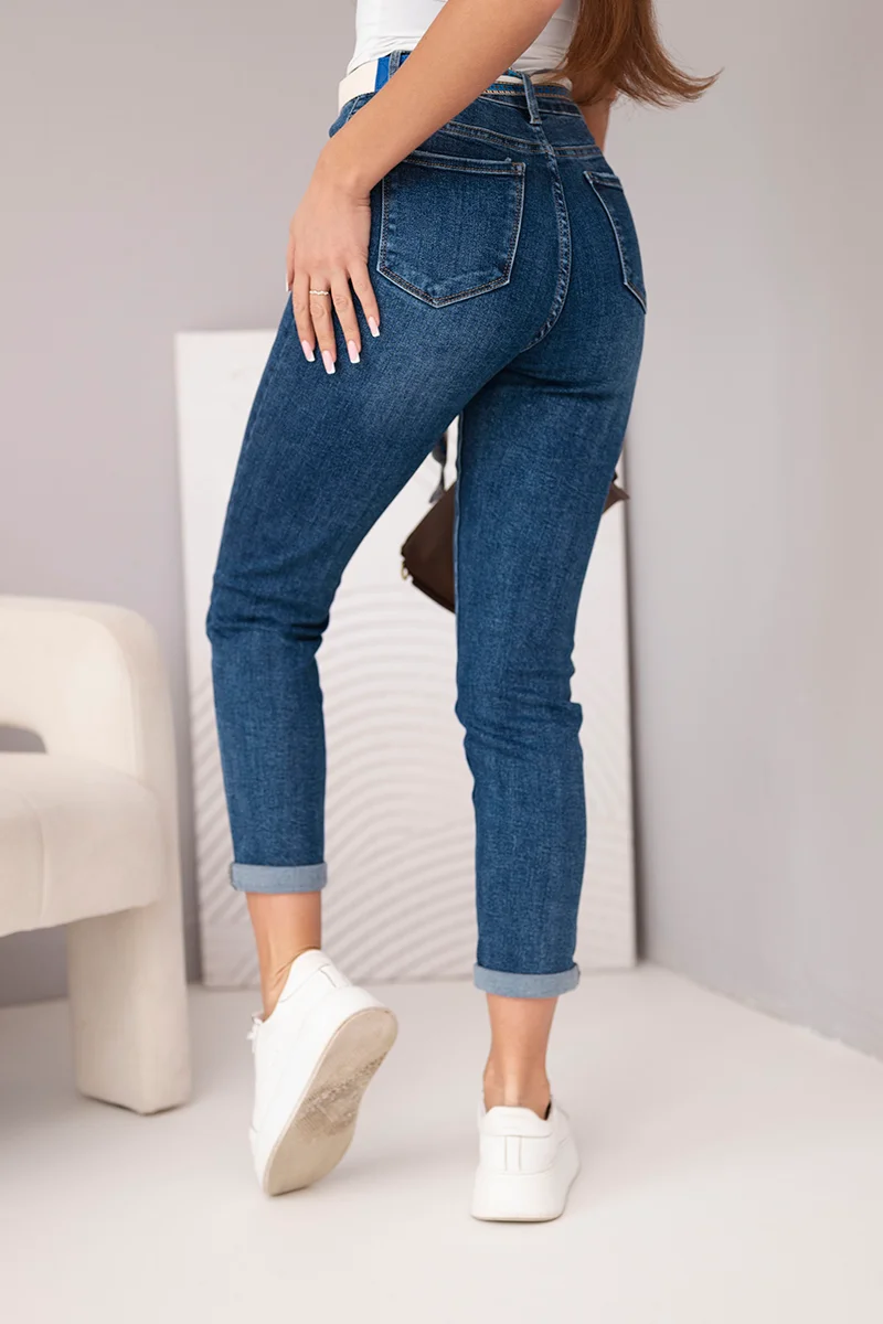 Spodnie damskie jeansowa Mom Fit z wysokim stanem i kontrastowym paskiem ciemno jeansowa