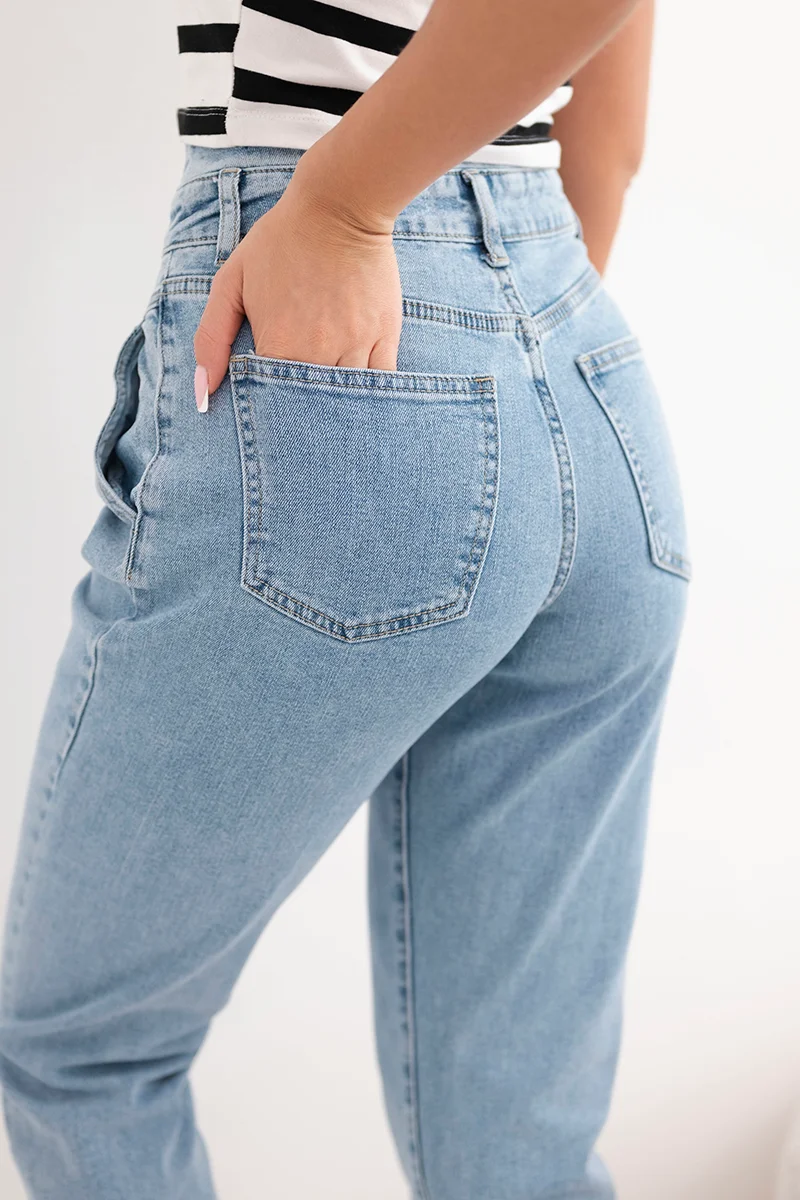 Spodnie damskie jeansowa Mom Fit z wysokim stanem i kontrastowym paskiem ciemno jeansowa