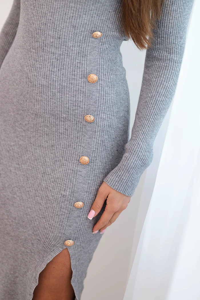 Sukienka damska prążkowana z golfem i ozdobnymi guzikami szara