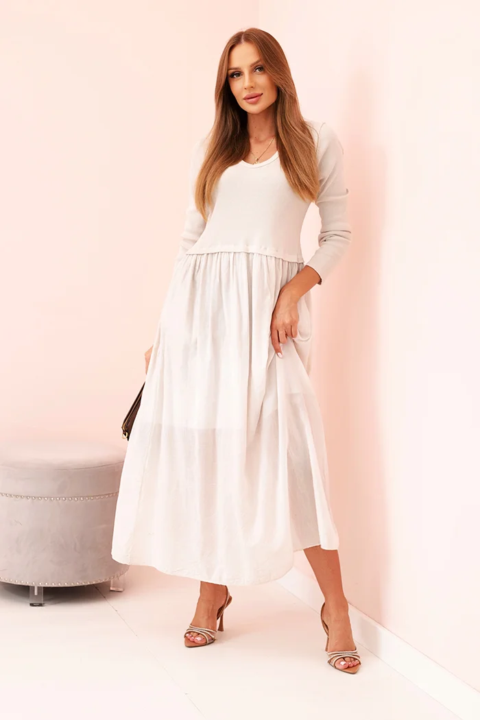 Sukienka damska z bawełną z długim rękawem i dekoltem V jasno beżowa