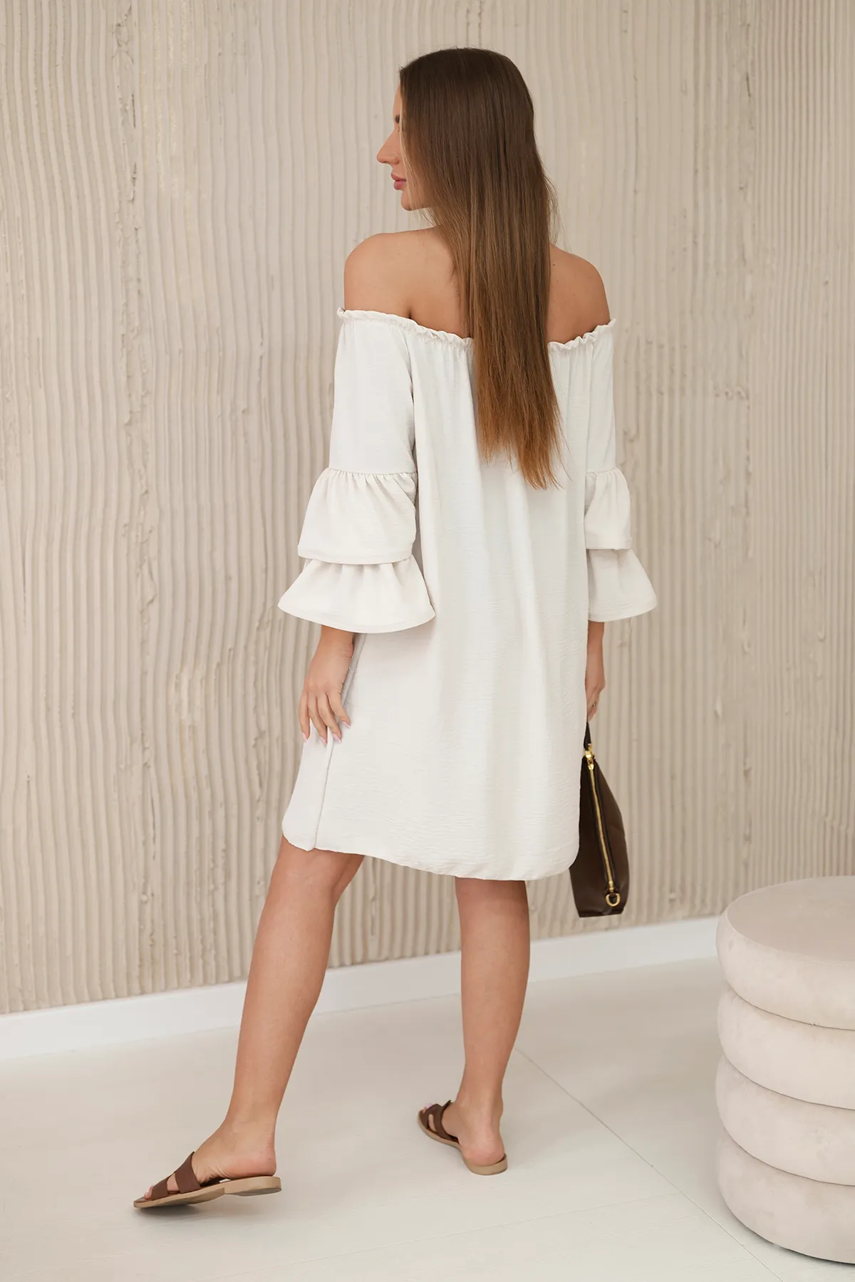 Bluzka hiszpanka z falbankami na rękawie camelowa