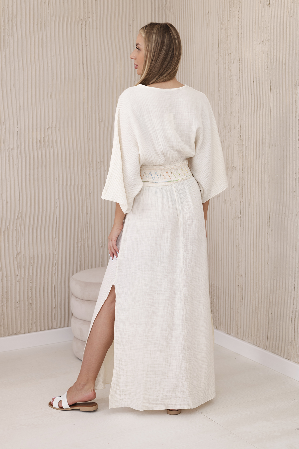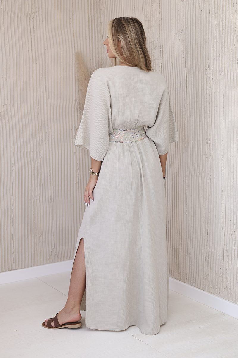 Sukienka muślinowa z haftem w talii beżowa
