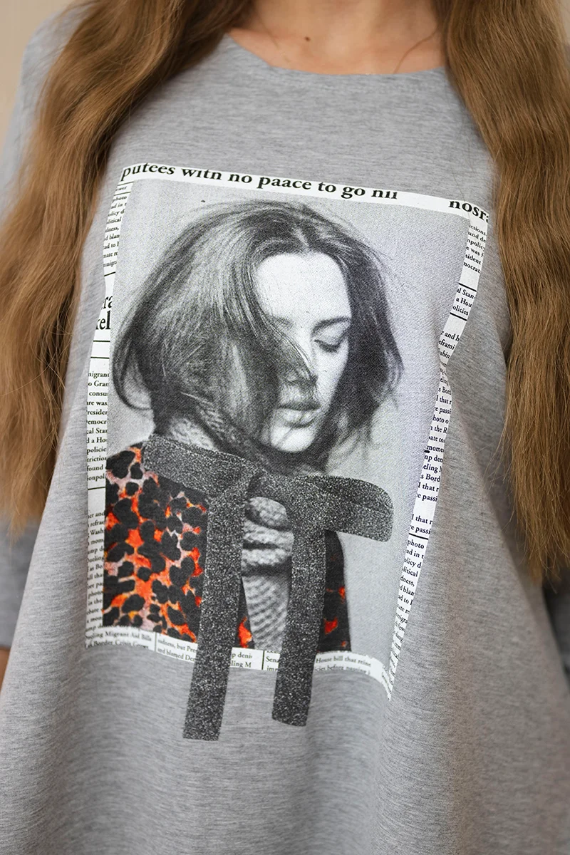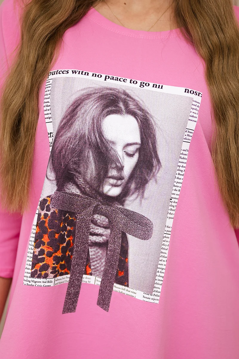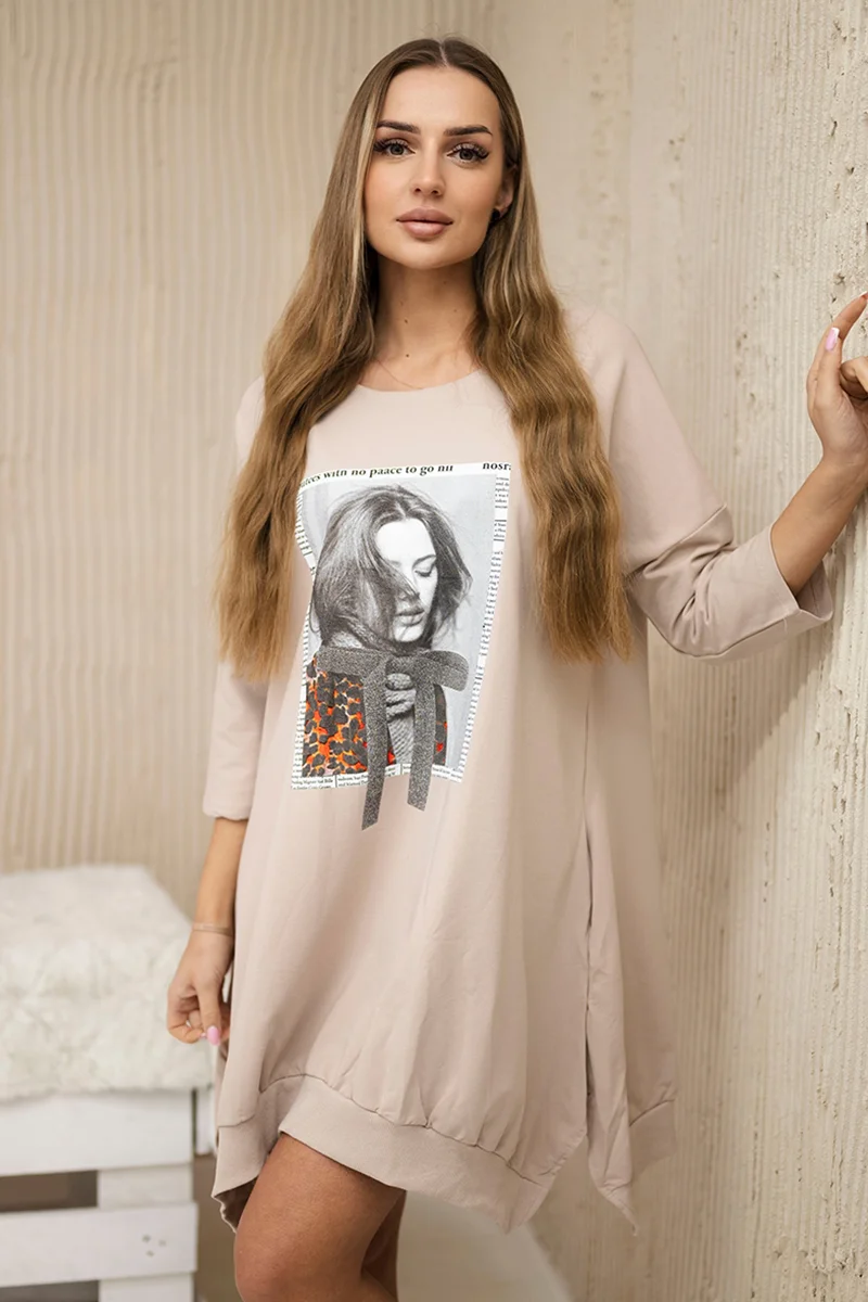 Bluzka oversize z nadrukiem tęczowych ust camelowa