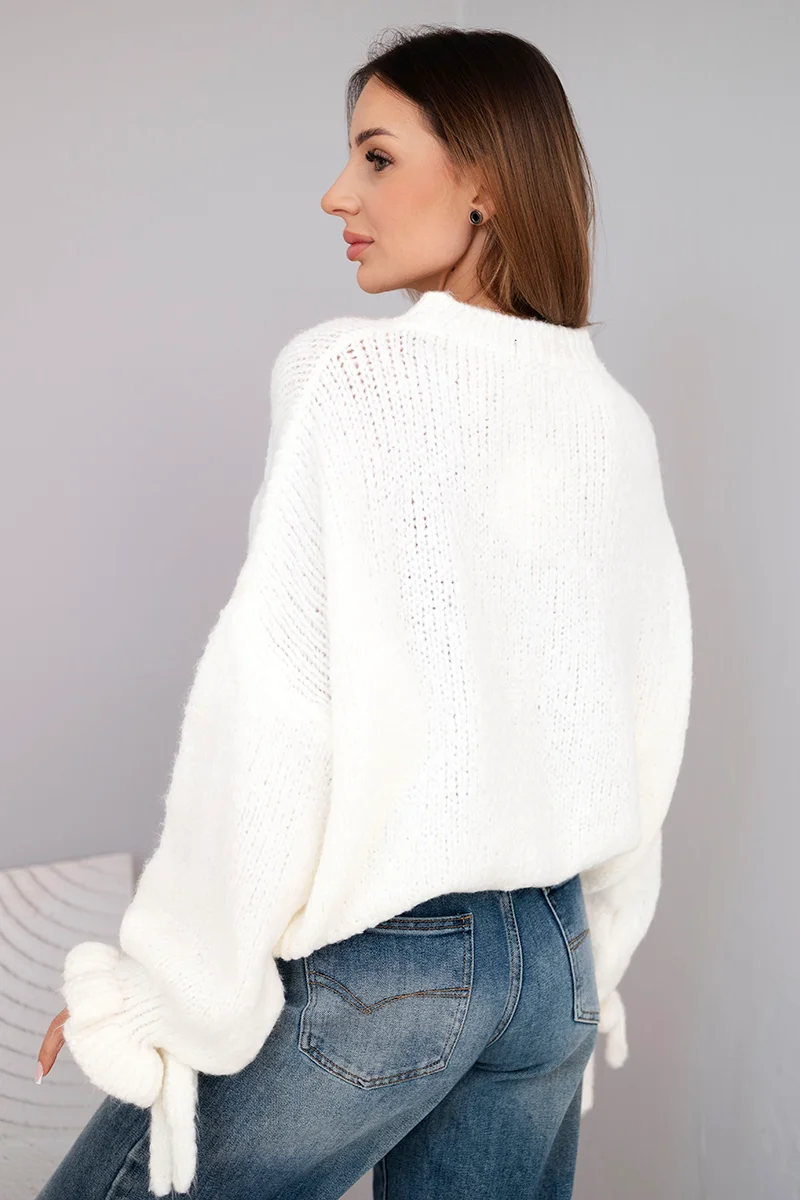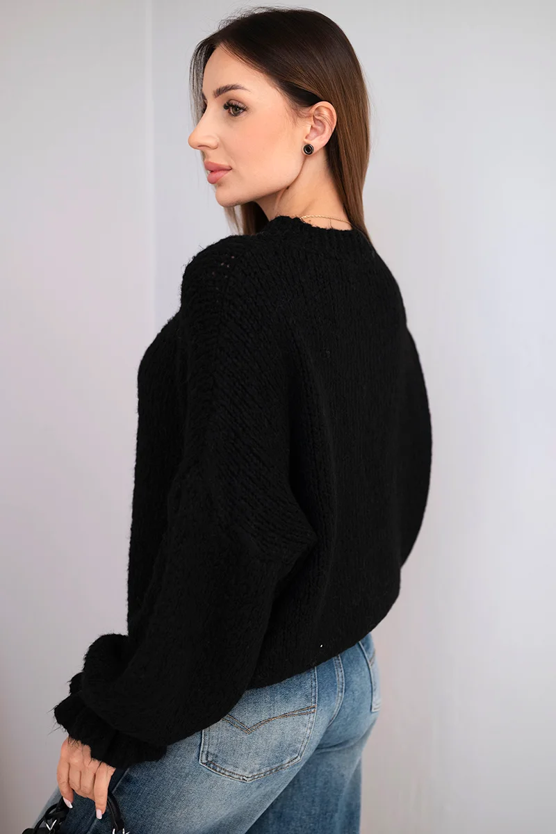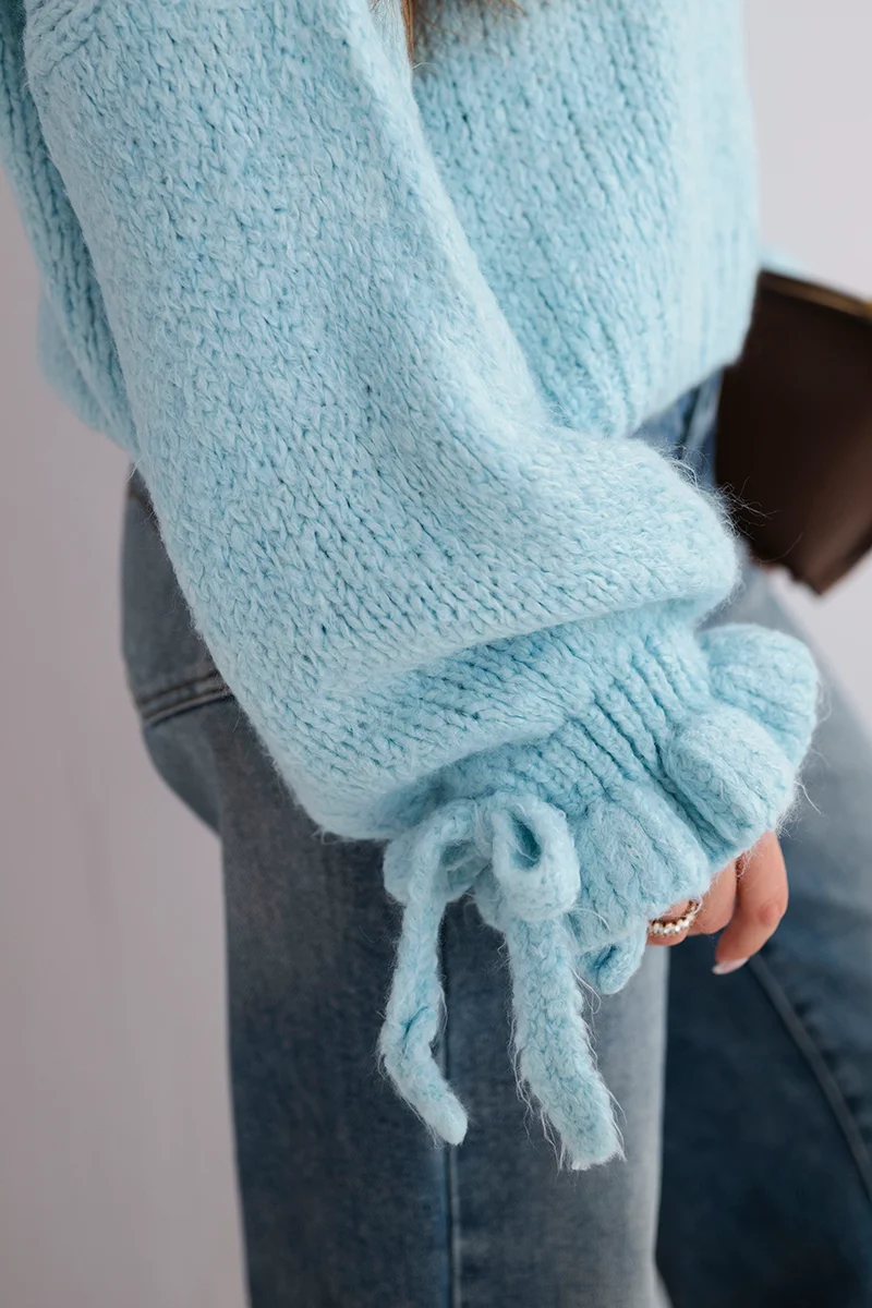 Sweter damski z dodatkiem moheru z grubym splotem i ozdobnymi rękawami niebieski