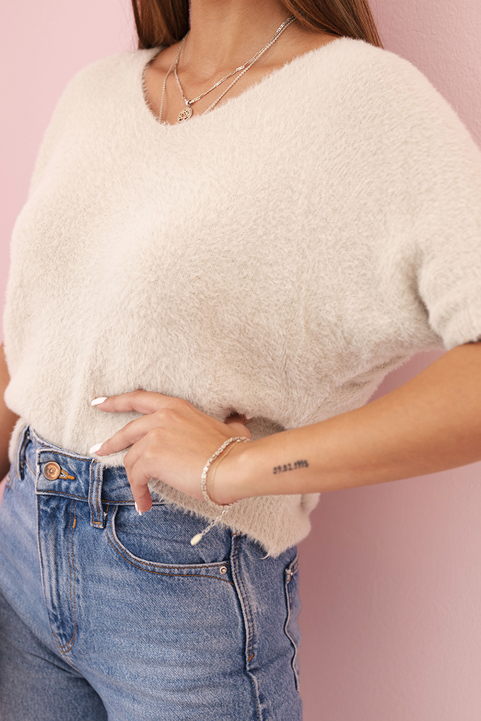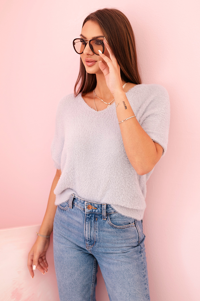 Sweter damski z miękkiego włosia z dekoltem V krótki rękaw żółty